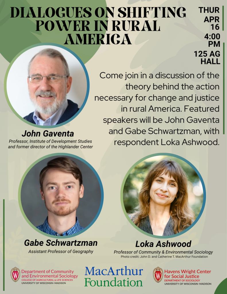 Please join us for the Community and Environmental Sociology Haller lecture on April 16th at 4:00 in 125 Ag Hall. John Gaventa and Gabe Schwartzman will be speaking on “Dialogues on Shifting Power in Rural America” with respondent Loka Ashwood.